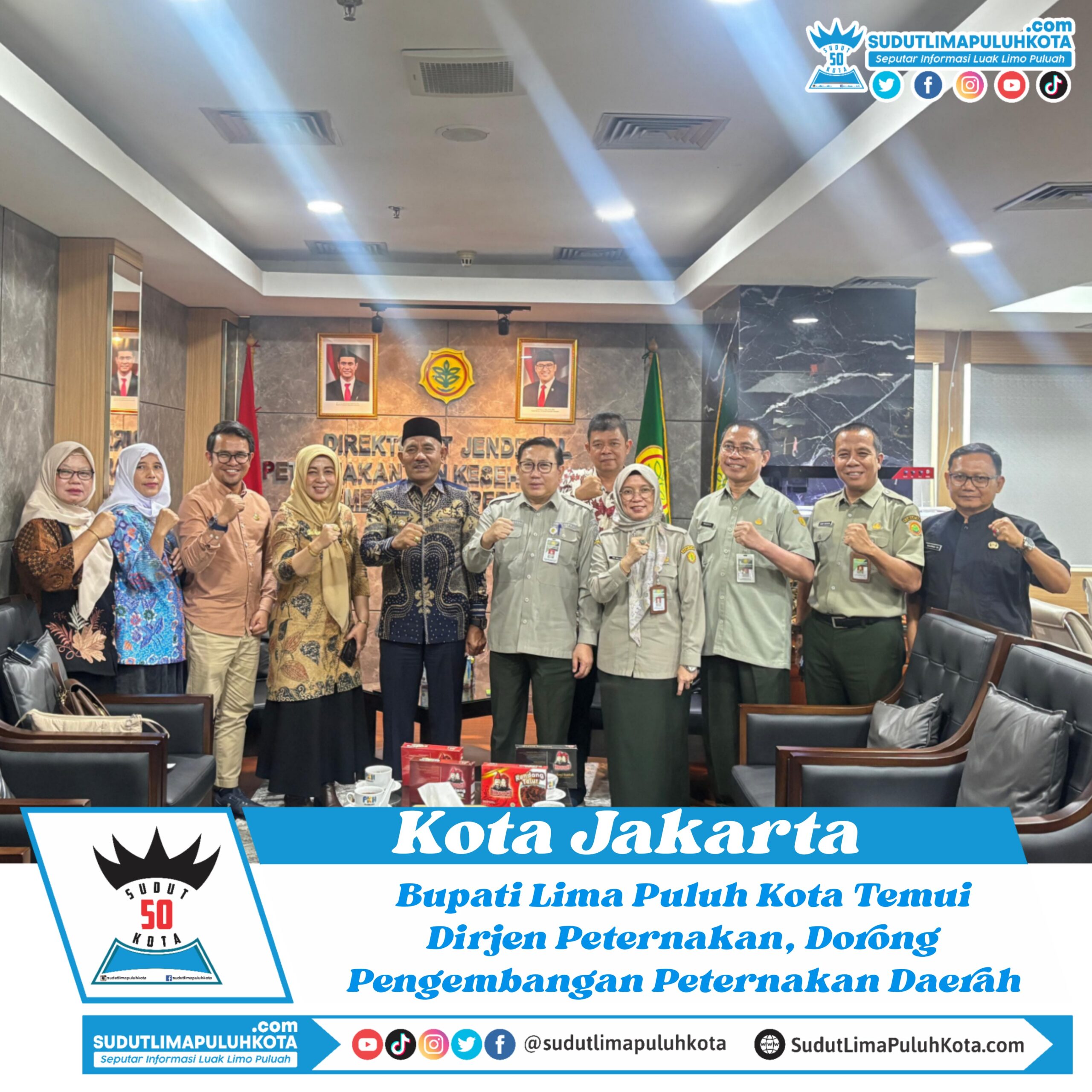 Jakarta, http://sudutlimapuluhkota.com — Bupati Lima Puluh Kota, Safni Sikumbang, menemui Direktur Jenderal Peternakan dan Kesehatan Hewan Kementerian Pertanian RI, Agung Suganda, pada Jumat (09/05/2025) di Kota Jakarta. Pertemuan ini membahas strategi pengembangan sektor peternakan di Kabupaten Lima Puluh Kota guna memperkuat ketahanan pangan dan meningkatkan perekonomian masyarakat.