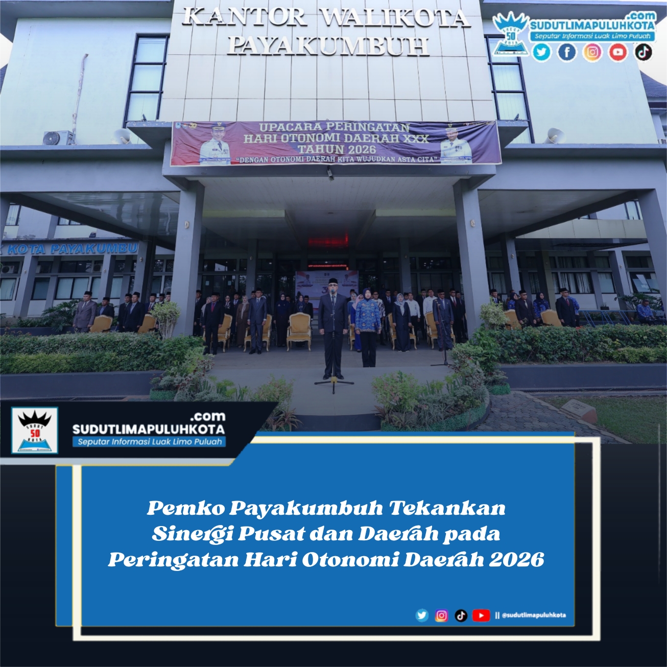 Payakumbuh, http://sudutlimapuluhkota.com — Pemerintah Kota (Pemko) Payakumbuh menegaskan pentingnya sinergi antara pemerintah pusat dan daerah dalam mempercepat pembangunan serta meningkatkan pelayanan publik pada upacara peringatan Hari Otonomi Daerah ke-30 Tahun 2026 di halaman Balai Kota Payakumbuh, pada Senin (27/04/2026).