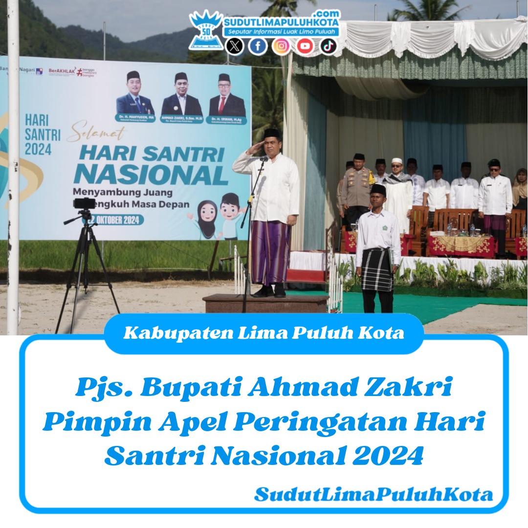 Apel peringatan Hari Santri Nasional 2024 ini dipimpin oleh Pjs. Bupati Ahmad Zakri dan diikuti oleh Kepala Kantor Kemenag Irwan, pimpinan-pimpinan pondok pesantren serta sejumlah perwakilan santri di Lima Puluh Kota.