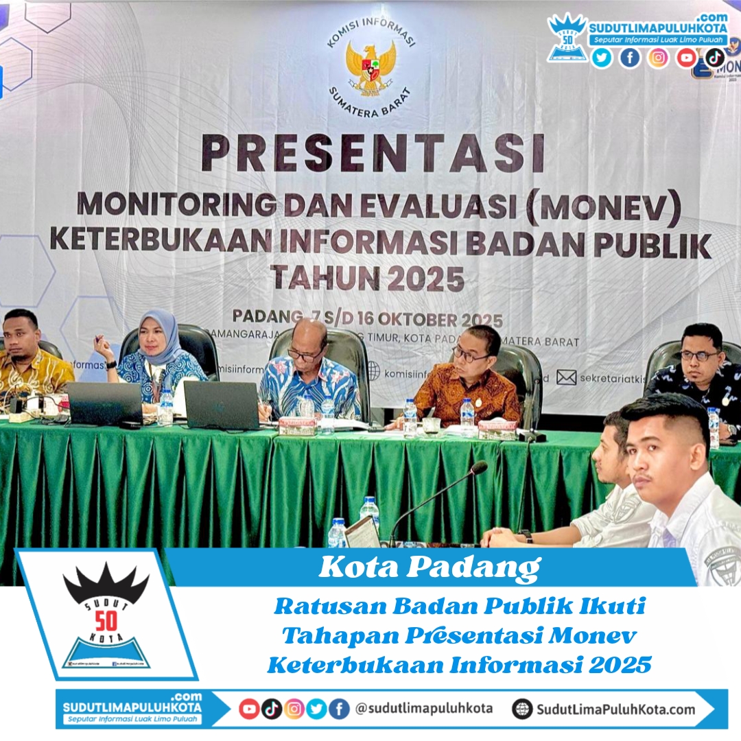 Padang, http://sudutlimapuluhkota.com — Komisi Informasi (KI) Sumatera Barat resmi memulai tahapan Presentasi Monitoring dan Evaluasi (Monev) Keterbukaan Informasi Publik 2025, pada Selasa (07/10/2025). Sebanyak 128 badan publik dari berbagai kategori dijadwalkan mengikuti tahapan ini di Kantor KI Sumbar hingga 16 Oktober mendatang.